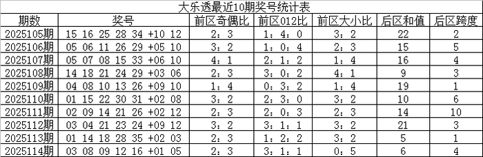 大乐透第2025114期奖号为:03 08 09 12 16+01 05。当期前区奖号012路比为3:1:1,冷热比为4:1,莫得重号,包含连码组合08 09,后区开出全奇、全小组合。