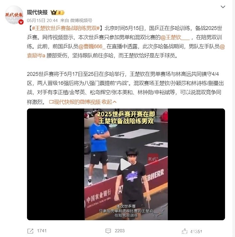 2025年多哈世乒赛开赛前一日,中国乒乓球队正紧锣密饱读地进行临了冲刺,干系词,一则对于主力球员王楚钦临时担任男双陪练的音书激发山地风云,据《当代快报》报说念,由于队内左手陪练袁励岑突发腰伤,另又名替补左手球员曹巍因护照问题未能实时抵达多哈,国乒男双陪练资源告急,在此情况下,原来仅需备战男单和混双的王楚钦,竟被临时安排为男双组合提供陪练,这一决定飞速成为公论焦点
