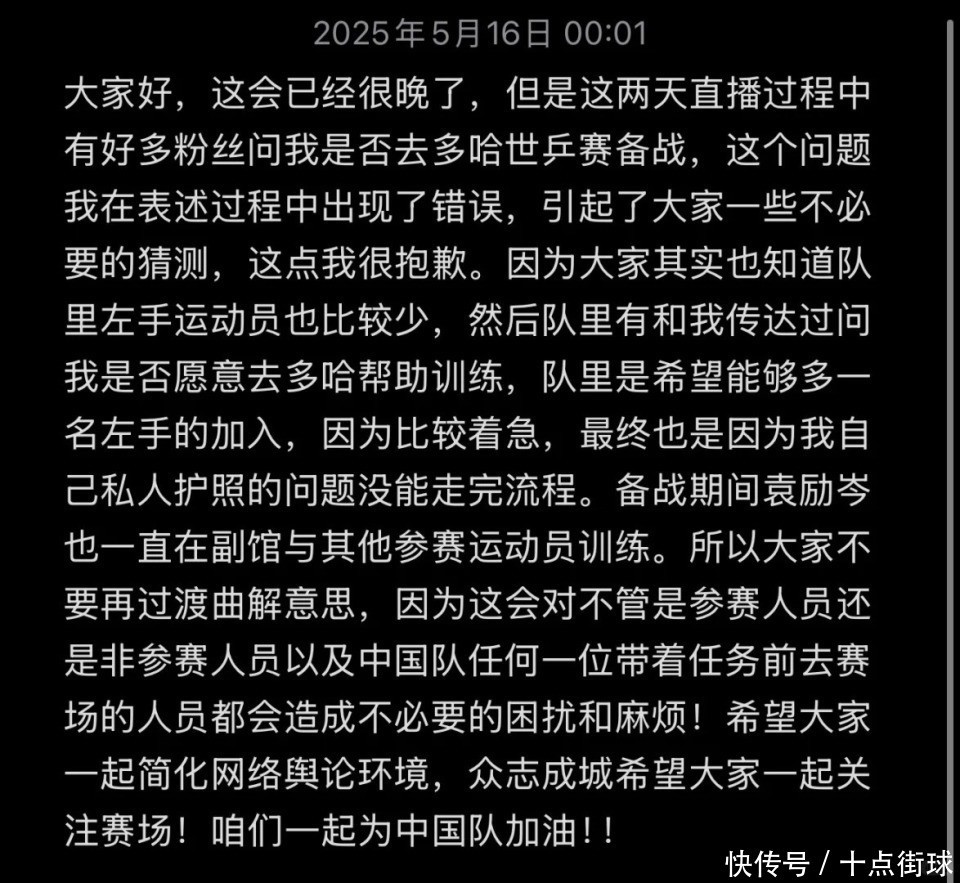 争议的导火索源于国乒左手球员的突发景象,原定陪练袁励岑在抵达多哈后因腰伤复发无法泛泛检会,而替补球员曹巍因个东说念主护照问题未能成行,导致左手陪练资源枯竭,尽管国乒训导组示意“必要时可从国内调派其他左手球员”,但斟酌到时候紧要,最终决定由同为左手执拍的王楚钦临时补位,对此,部分球迷质疑:“主力选抄本应专注本身方法,为何要为团队断送个东说念主备战时候?”