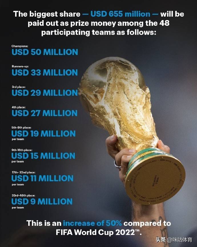 海外足联日前晓示,投入2026年好意思加墨寰宇杯的48支球队将赢得诡计7.27亿好意思元的奖金和补贴,其中冠军将赢得5000万好意思元奖金